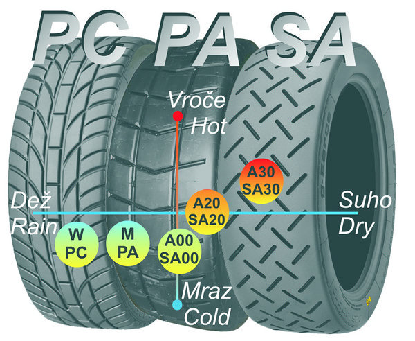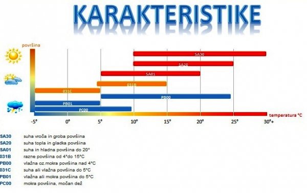 PA00 - Vlažen asfalt, majhna do srednja obremenitev (od 2°C do 20°C), mehka zmes za dež, delovna temperatura tekalne površine za optimalni oprijem od 25°C do 60°C.